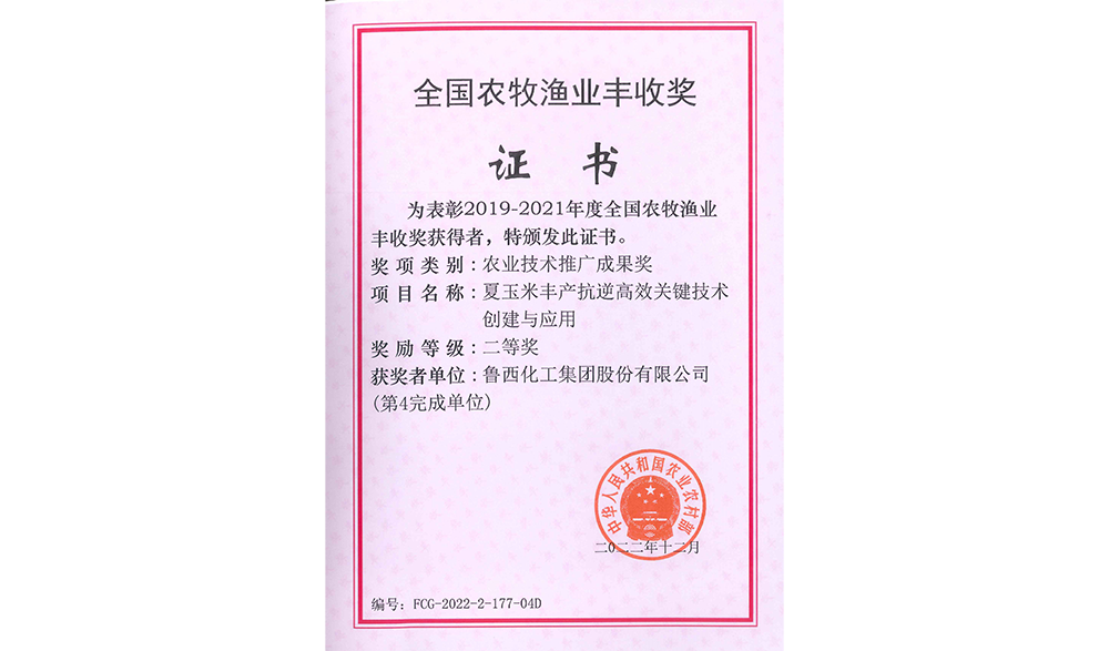 魯西化工集團股份有限公司聯合山東農業大學深耕夏玉米豐產抗逆高效關鍵技術創建與應用,2022年9月,利用公司尿素硝銨溶液和液體肥研究的夏玉米豐產抗逆技術,被農業農村部授予農業技術推廣成果獎二等獎,為保障國家糧食安全做出了重要貢獻。近日,該技術又喜獲“全國農牧漁業豐收獎”。
